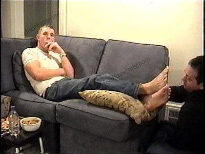 After a workout as a personal trainer, he is dressed in jeans, T-shirt, white sweat socks, & sneakers as he relaxes on the soft with his foot slave kneeling at his feet for the first service of his sweaty socks & bare feet worship. During a foot massage & service, he is being interviewed about this new position that he is experiences of controlling, commanding, verbal responses & enjoys the power of being Straight jock with slaves who pay to be dominated by him while at his feet. Shawn kneels at Nash’s socked feet for long massage, kissing and sniffing, along with bare feet & toes massaged & kissed. Straight jocks rule. Two views of this scene, one full, and one close up. Nash does this naturally and is amused at the newness of this situation of the power trip at his feet. He is very well built with size 13 feet, very easy going & friendly. He is just learning about how it feels to have a submissive grovel at his feet.