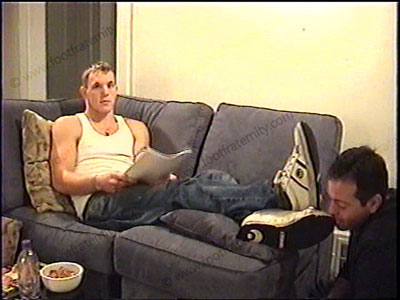 After a workout as a personal trainer, he is dressed in jeans, wife beater, white sweat socks, & sneakers as he relaxes on the soft with his foot slave kneeling at his feet for the second service of his sweaty socks & bare feet worship. During a foot massage & service, he responds to your questions about this new position that he is experiences of controlling, commanding, verbal responses & enjoys the power of being Straight jock with slaves who pay to be humiliated by him while at his feet. Shawn kneels at Nash’s socked feet for long massage, kissing and sniffing, along with bare feet & toes massaged & kissed. Straight jocks rule as this one is photographed during this session. Two views of this scene, one full, one different angle. Nash does this naturally and is amused at the newness of this situation of the power trip at his feet. He is very well built with size 13 feet, very easy going & friendly. He is just learning about how it feels to have a submissive grovel at his feet.