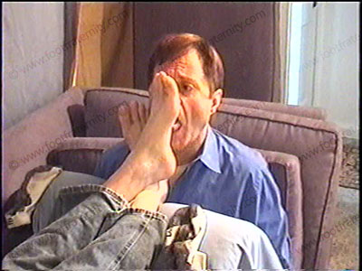 After work, he is in jeans, white sweat socks, & sneakers as he relaxes on the Lazy boy chair with his foot slave pinned at his feet for the second service of his sweaty socks & bare feet worship. During a foot worship & service, he responds to questions from his straight buddy about this position as god to foot slaves. He is into controlling, commanding, with verbal responses & enjoys the power of being Straight jock with slaves who pay to be humiliated while at his feet. There is foot kissing and sniffing, along with sock sniffing & total feet in the face. Straight jocks rule & love this power as he laughs at the domination. Two views of this scene, one full, and one close up. J. Bailey does this naturally and is amused at the newness of this situation of the power trip at his feet. Spit, ashing in slave’s mouth, puts cigarettes out on his tongue, suck toes, eat toe sweat, etc. He is strong with size 13 feet, very cocky & relaxed as he likes this worship. He likes how it feels to have a submissive grovel at his feet. Much humiliation.