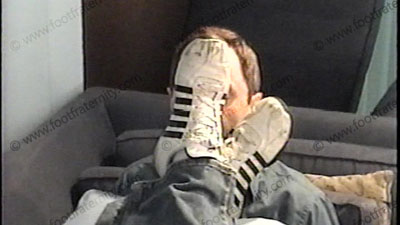 In sneakers & Under Armor work out shirt, white/grey sweat socks, this really macho Stud, Travis’s brother, Jay, relaxes & humiliates, dominates & teases his sissy slave at his feet as he relaxes on the Lazy-boy with his foot slave pinned at his feet for worship & service of his sweaty socks & perfect high arched bare feet. He talks & embarrasses his bitch sissy slave with cocky arrogance of a young guy - domination, humiliation, verbal, teasing, foot sniffing/licking, cigarette ashing, etc. Then sock sniffing, bare foot worship, licking, etc. One full view, one a close-up. His commands are humiliating as he knows he is a Master to all sissy foot slaves! He shoves his socked, then bare, meaty, perfect shaped, high arched feet in the bitch’s face to control his breathing! He now knows exactly how to dominate a foot sissy like a Marin would do it. He mocks the slave & toys with him by pushing hard, his jock feet on his slave’s face as he laughs at the humiliation & domination that his control & power can inflict. Then he uses his foot to slave his bitch’s face many times.