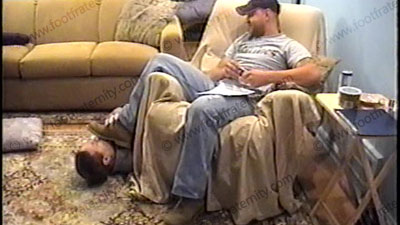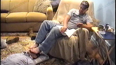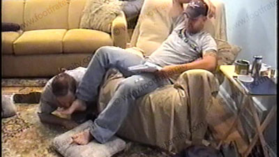 After work, he is in jeans, baseball cap, black sweaty thick socks & boots as he relaxes on the easy chair with his foot slave at his feet for service of his sweaty socks & bare feet worship. During this worship, slave has to give him a new leather jacket & kiss his feet for taking it. He taunts, teases, humiliates & dominates his sissy slave. He is into controlling, commanding, with verbal control & enjoys the power of being a Straight stud with slaves who pay to be humiliated while at his feet. There is foot kissing and sniffing, along with sock sniffing & total feet in the face. Straight jocks rule & love this power as he laughs at the domination control & power. Two views of this scene, one full, and one close up. He spit his old chewed gum in sissy’s mouth for him to swallow, then eat toe jam, nose between macho toes, feet all over the slave’s face, armpit action & much more. He is cocky & arrogant as he demands foot worship. Complete domination & humiliation with total power at his feet. He mocks, teases & taunts throughout the scene.