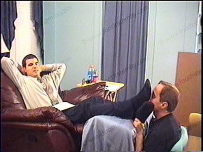 After a work, Vaughn is dressed shirt/tie, dark gold toe nylon dress socks & lace up shoes as he relaxes on the Lazy boy chair with his foot slave beneath at his feet for service of his sweaty socks & bare feet worship. During a foot worship & service session, he responds to his buddy’s comments about this power position that he is experiencing of controlling, commanding with many verbal responses & enjoys the power of being a Straight jock with slaves who pay to be humiliated by him while pinned at his feet. His sissy slave is kissing and sniffing the socked feet, along with bare feet action. Straight jocks rule again as he gives commands of how he is to be treated now. Two views of this scene, one full, one different angle. Vaughn does this naturally and is amused at this situation of the power trip at his feet. He is hot with size 12 feet, very into power. He is very cocky and he likes this worship. He makes his sissy eat his toe nail clippings & gives much verbal abuse & teasing. He takes some blackmail photos & loves to tease and mock his foot slave into total humiliation.