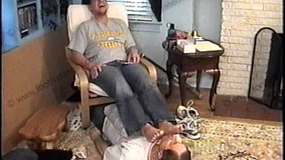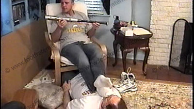 After work, verbal, sports jock, arrogant, super macho Master Grayson is in jeans, T-shirt, sweaty white socks as he relaxes on the chair with his foot slave beneath at his feet. During a sock sniffing & service, he tells his bitch what he expects as he humiliates him beneath his socked & bare feet & tells his thoughts about foot slaves while wiping his sweaty socks in his bitch’s face & forcing foot sniffing & kissing. Two views of this scene, one full, and one close up. Then bare foot action for more of the same. He is amused, cocky, macho and loves getting paid by foot slaves to lick, kiss, and suck on his bare feet while he relaxes. He tells about the entire foot domination scene. He is a Stealers man and forces his feet in the face of a Browns fan. He uses the power that he has in a, “smart ass” guy manner. Total foot fetish film for fantasy becoming reality! He spits in face, mocks foot slave with teasing chants & tells of how he feels about having a bitch. He dominates & teases using his sissy as a foot wipe and slave. Constant foot flexing in sissy’s face. Mostly barefoot action – toes in nose, licked, sucked, kissed and more. He is arrogant and powerful.