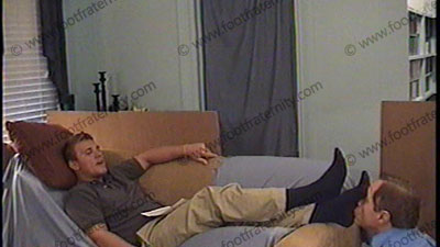 This macho Jock Yuppie is dressed in slacks, nice shirt, cordovan Bass Weejun Penny loafers & Tommy H. dark dress socks as he relaxes on the sofa with his foot slave kneeling at his feet for the service to his feet while he verbally dominates & humiliates his bitch who has to serve him. Grayson teases about rear worship & he steps in slave’s dessert to have him lick it from his sweaty toes when wipes is all over slave’s face. Two views of this scene, one full, and one close up. Grayson orders foot worship & then when socks are removed his slave has to sniff Grayson’s bare feet, lick them and clean between his toes, sucking toes & more, while this Master laughs, mocks and teases like crazy. Total verbal teasing, humiliation & commands during foot worship as he uses slave’s face as a “play-toy” for his toes & feet both in socks and barefoot. He is good looking arrogant, conceited & cocky & truly controls his foot sissy bitch slaves. He naturally KNOWS just what to say to tease, and dominate foot sissys with lots of mocking chants while “making fun” of his slave. Grayson does “mind control” knowing his foot slave’s thoughts, speaking them & teasing him for having the foot worship need. Much toe play with the slave’s nose and face. He teases about having slave’s credit card & cash to use for allowing him to worship his feet! WOW!