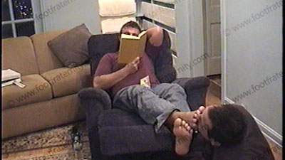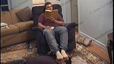 Grayson is dressed in jeans, thin white worn socks, & sneakers as he relaxes on the Lazy boy chair to have Shawn make love to his socked and bare feet while he is reading a book. Not a word is spoken as Shawn caresses & shows love to the feet of this hot guy. Two angles & positions. No domination, just foot love.
