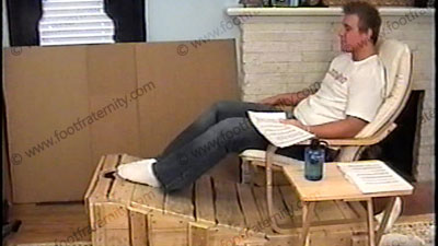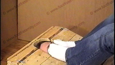 In jeans, t-shirt & smelly, sweaty white socks, Grayson has his slave locked in the confinement crate with only face exposed & sits on top of him while forcing his sweaty socks in the face & teasing & humiliating his slave. Two views, one full, one close up. He talks about the foot slave with commands & teasing, all about why “Straight Guys Rule”. This stud makes fun of the fact that he straight & can do this to a slave. Full cocky jock attitude, much laughter & teasing & smelling his feet - ANYTHING he wants! Giving orders & loving the power he now has while his feet are being worshipped & serviced. He does humiliating things to control, tease & embarrass his bitch. Verbal teasing & abuse. ALL SOCK ACTION in Part A.