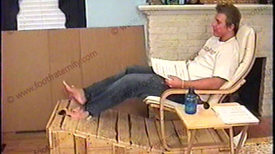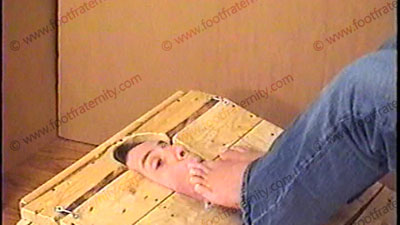 In jeans, T-shirt & bare feet, Grayson has his slave locked in the confinement crate & sits on top of him while forcing his sweaty feet in the face & teasing & humiliating his slave. There is foot action, Straight guys rules, bare foot action, licking between toes and more. Two views, one full, one close up. He talks about the foot slave with much laughing & teasing. Total humiliation, embarrassment, smell his feet, lick his feet, eat his toe jam, lick feet, toes sucked. ANYTHING he wants! Giving orders & loving the power he now has while his feet are being worshipped & serviced while flexing his feet and toes all the time. Straight Control of Foot sissys! All BARE FOOT ACTION in Part B.