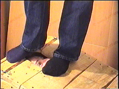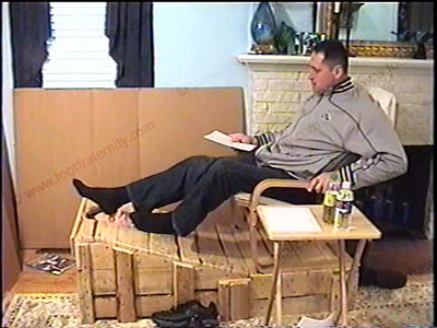 In jeans, jacket & smelly, sweaty dark socks, Morgan has his slave locked in the confinement crate with only face exposed & sits on top of him while forcing his sweaty socks in the face & teasing & humiliating his slave. Two views, one full, one close up. He talks about the foot slave with commands & teasing, all about why “Straight Guys Rule”. This stud makes fun of the fact that he straight & can do this to a slave. Full cocky jock attitude, much laughter & teasing & smelling his feet - ANYTHING he wants! He stands on his slave’s face! Then he sits on the sissy’s face while looking at a hot magazine & forcing the bitch to whiff his butt. Breaks wind in his face. Giving orders & loving the power he now has while his feet are being worshipped & serviced. He does humiliating things to control, tease & embarrass his bitch. Verbal teasing, spit, & abuse. ALL SOCK ACTION in Part A.