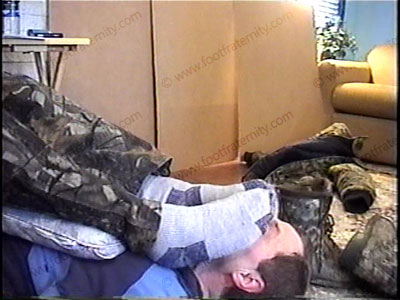 Socks, socks & more socks only. After hunting, in his camouflage hunters overalls (black t-shirt, huge muscular chest), boots, rifle & jacket, he comes home to relax on the easy chair with his foot slave beneath his feet for service of his dirty, sweaty gray hunting socks. During this worship, he commands, gives verbal teasing & abuse & laughs at the boot slave’s submission to him as he taunts teases, humiliates & dominates his sissy slave. He is into controlling, commanding, with verbal control & enjoys the power of being a Straight stud with slaves who pay to be humiliated while under his sweaty socked feet. There is total socked feet in the face & using him as a foot rest for those macho socked feet. Three views of this scene, one full, and two close up. He is strong, very cocky & arrogant as he demands boot worship. Complete teasing while handling his rifle during boot worship, domination & humiliation with total power at his size 15 feet, as he shoves them in his slave’s face.