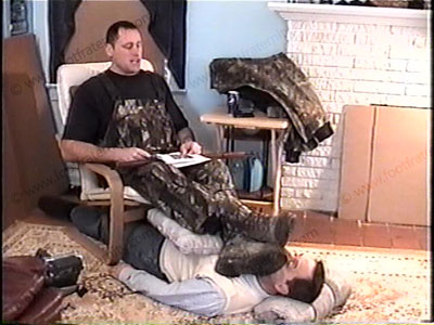 Boots that are licked clean after hunting, in his camouflage hunters overalls (black t-shirt, huge muscular chest), boots, rifle & jacket, he comes home to relax on the easy chair with his foot slave beneath his feet for service of his dirty, muddy boots & sweaty dark boot socks. During this worship, he described the new web site constructed in worship to him and his boots, socks & feet. He commands, gives verbal teasing & abuse & laughs at the boot slave’s submission to him as he taunts teases, humiliates & dominates his sissy slave. He is into controlling, commanding, with verbal control & enjoys the power of being a Straight stud with slaves who pay to be humiliated while under his muddy boots & really sweaty socks. There is licking the mud off of the boot lug soles & then sweaty socked feet in the face & using him as a foot rest for those macho boots & socked feet. Two views of this scene, one full, and one close up. He is strong, very cocky & arrogant as he demands boot & sock worship while describing the web site for his slaves. Complete teasing during boot & sock worship, domination & humiliation with total power at his size 15 boots, as he shoves them in his slave’s face. (No bare feet).
