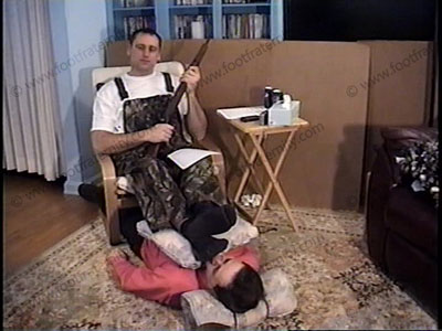 – Boots & more boots after Morgan gets back from hunting. In his camouflage hunters overalls (white t-shirt, huge muscular chest), muddy boots & rifle, he comes home to relax on the easy chair with his foot slave beneath his feet for service of his dirty, muddy boots. During this worship, he commands, gives verbal teasing & abuse & laughs at the boot slave’s submission to him as he taunts teases, humiliates & dominates his sissy slave. He is into controlling, commanding, with verbal control & enjoys the power of being a Straight stud with slaves who pay to be humiliated while under his muddy boots. There is licking the mud off of the boot lug soles & total booted feet in the face for the first third of the scene. Two views of this scene, one full, and one close up. He is strong, very cocky & arrogant as he then demands sweaty sock worship of his really smelly dark boot socks. Then ending with bare foot action, licking, kissing and more. Complete teasing during this worship, domination & humiliation with total power at his size 15’s, as he shoves them in his slave’s face. Slave is blackmailed and has to give Morgan new cowboy boots as a gift.