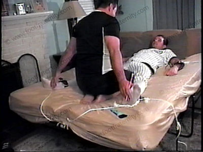 Addison’s slave, Sean, slips him a “mickey” in his drink & when Addison is passed out after a baseball game (still in uniform), Sean has Addison strapped to the bed. Sean begins taking revenge and ticking the socked feet and then the bare feet of Addison until he asks for mercy. Sean is jealous of the time Addison has with his new slave, Austin, so Sean does a full tickle scene on the feet and body of bound Addison! His hands also caress the body. Then Darren comes in at the end, so he and Sean can “double team” and tickle Addison even more! Three sensational views of a very hot TICKLE scene of poor, straight Addison being tormented and tickled. Addison struggles, but can’t get free from this tickle bondage.