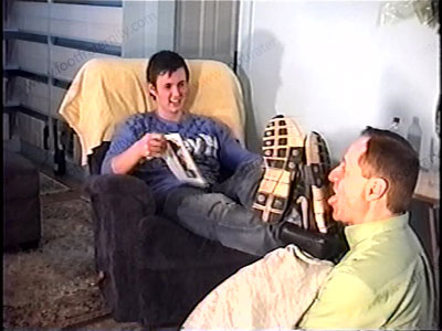 In jeans, old sneakers & sweaty blue Puma work out socks, Kendell starts out with his sissy sitting at his Footstool with Kendell’s feet in his face, while he is teasing his sissy with his feet up on the padded tray which is level with his slave’s face. His foot sissy as has to smell, kiss, lick and worship Kendell’s socked feet, then bare feet while being teased & humiliates at his Master’s feet. While humiliating his slave, he makes comments, teases and humiliates the sissy who needs this domination & at Master’s feet while he relaxes & enjoys the power. He uses his toes and puts his feet in the sissy’s face during the whole time, just to tease us with his high arched yuppie size 11 feet. He teases, mocks him & takes control. He looks at a website designed to serve his feet. He gives the commandments as being our god that his foot slaves must follow. Three hot wonderful angles & views of this scene with one close up. He truly loves to own all foot slaves & have them at his superior straight feet & NEEDS the power & control. It’s total humiliation to have to serve a guy like this who once teased us in gym class!