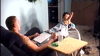 In jeans, boat shoes, (no shirt) & sweaty thick & thin sheer dark socks, Apollo starts out with his sissy sitting at his Footstool with Apollo’s feet in his face, while he is teasing his sissy with his feet up on the padded tray which is level with his slave’s face. His foot sissy as has to smell, kiss, lick and worship Apollo’s socked feet, then bare feet while being teased & humiliates at his Master’s feet. While humiliating his slave, he makes comments, teases and humiliates the sissy who needs this domination & at Master’s feet while he relaxes & enjoys the power. He uses his toes and puts his feet in the sissy’s face during the whole time, just to tease us with his perfect, Alpha size 13 feet. He teases, mocks him & takes control. He answers some comments designed to serve his feet. He gives the commands as being our god that his foot slaves must follow while giving the “ha ha” response. Three hot wonderful angles & views of this scene with one close up. He truly loves to own all foot slaves & have them at his superior straight feet & demands the power & control. It’s total humiliation to have to serve a guy like this who plays college football & has his sissy slave to serve as his human ash tray & puts out his cigs on slave’s tongue.