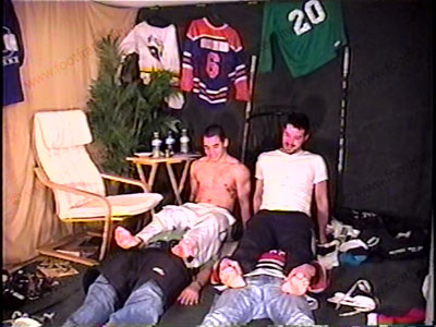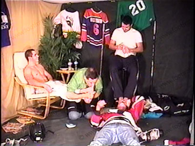 Hockey Jocks Addison & his cousin Burke are humiliating Austin in the locker room when the equipment manager walks in. The Jocks threaten to show the photos to the school board if the manager doesn’t submit to them as well by forcing him to sniff their jock straps, butts, socks & feet etc. They ride him like a horse and use their hockey sticks to paddle his butt. They trample both guys with one under each foot. They think of many ways to embarrass the guys including forcing their bare butts their faces to be kissed and sniffed. They sit on them, play with their crotch with their sticks, make them lay beneath their feet for foot licking & humiliation and EVEN MORE! , Total humiliation & domination of both guys. They are humiliated as they have to take what these macho jocks dish out. Much teasing hot talk from both studs while their feet are sniffed, licked, kissed and serviced in all ways. They degrade them & tease the slaves into permanent worship & slavery to them. They trample, ride him like a horse & use him as an ash tray. They shove their feet, butt, & crotch in the sissy’s faces throughout the entire scene. Four sensational views of this unbelievably real scene. Much teasing & laughter while the jocks are in EVERY position with the helpless slaves. More action than you can imagine making this fantasy into a reality for everyone! HOT!