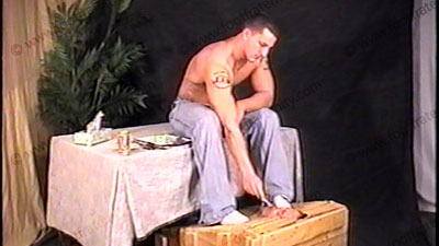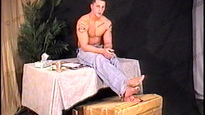 With his slave locked in a specially built confinement crate with only his face available through a hole in the top, Apollo with no shirt, (hot chest) jeans, thin white sweaty baseball socks, teases & torments the slave’s face since he cannot move & must take whatever is dished out. Apollo removes his sneakers to wipe his sweaty socks in his slave sissy’s face. He tramples the slave’s face, sits on his face as he is trapped in the newly designed confinement crate which he has under his workbench table. He has his sweaty socks sniffed & bare feet serviced kissed & licked as he flexes his feet, uses them to “toy” with his slave’s face & does constant foot movement to the helpless face. He responds to Tommy, his brother, about having foot sissys in this position. Three hot views, one full, one close up, and one side full view as Apollo gives orders, teases & humiliates his slave who must do much foot service, toes in nose, feet constantly licked & kissed, etc. He spits in slave’s face & mouth, teases & gives verbal abuse. Apollo loves this power of a foot slave bitch in the “sissy cage” so much that he wanted to show his brother. He commands & teases through the whole scene of the power he has with his feet that are constantly in the slave’s face and mouth. He ashes in the mouth & totally humiliates & dominates as he just chills to talk with his feet on the imprisoned slave’s face.