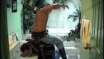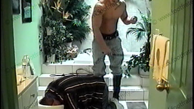In jeans & black leather harness boots, no shirt, perfect body Master Apollo has his slave cleaning his toilet after you see him taking a piss in it. He uses his booted foot to push slave’s face in the toilet while paddling & whipping him. (Two views of the “toilet” scene in this Part A) His slave bitch is at his mercy to be paddled & whipped. He uses a belt, riding crop, barber strap, paddle, cat-o-nine tails & bare hand on the slave’s butt. Slave uses his toothbrush to clean the toilet while being paddled. He gives orders, commands, teases & controls while really giving a strong whipping his foot slave. He uses all his power to wallop the whipping on his sissy slave’s butt from all positions & from many sensational film angles (part one of this DVD and part two on film #5312). Makes slave sniff & kiss his sweaty butt & arm pits. MUCH swatting & teasing, spitting, butt sniffing & kissing, puts him on a leash & much as he pulls the slave down to the work out dungeon. He smokes & ashes in slave’s mouth. Puts the cigarettes out on the slave’s tongues. Master Apollo’s boots remain on during all of the film. He humiliates, dominates and teases his whipping slave while commanding, taking out all his aggression with his power. He sits on slave, wallops & whips his ass! Armpit licking, bitch slapping & more. Master Apollo, his powerful body & his size 13’s RULE. Along with his powerful arms and body that give the strongest paddling & whipping to take out his aggression. It’s many hours of paddling!