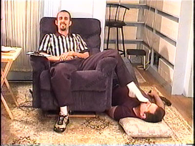 Hot stud Cooper, the straight jock gets back from a game to have his slave, Sean, remove his sneakers to worship his sweaty white socks and hot bare feet. He sits in his lazy boy chair with his leg over the arm of the chair, dangling his foot in Sean’s face. He is verbal, bigoted, commanding & cocky with a foot slave. He responds to the power while embarrassing his slave. He is amused at the control of making his slave remove his sweaty sneakers & serve his white sweaty socked & bare feet & be humiliated & dominated by them. He has slave on the floor, beneath his feet while he relaxes for domination, worship & service as he sits back in his easy chair. Slave is in all positions & must smell his sweaty socks as he teases & laughs at the power his feet have in his slave’s face & in his crotch while he tells his audience about doing this. Three film angles – one close-up from the, one full length, one from a moving camera. He controls & teases his slave while realizing his power as he gives teasing, comments, commands & watches with lots of foot in slave’s crotch while the other is in his face. He mocks & takes a lot at this power of teasing with his toes & feet both in socks and barefoot as he gives commands & orders to his foot slave who needs his feet. He likes to snicker & tease as he has a cigarette & laughs at the power his feet have over us foot slaves. He does it all in a cocky, sometimes rude & controlling manner. He is amused about our needs to worship the macho feet of this hot straight arrogant jock stud. He makes all kinds of comments with his inner thoughts while the power sinks in that his foot lickers are helpless to his feet & he decides that he will be doing this for a long time. He really likes the “power trip” that it gives to him while he laughs at his power over foot slaves while his straight feet are being worshipped.