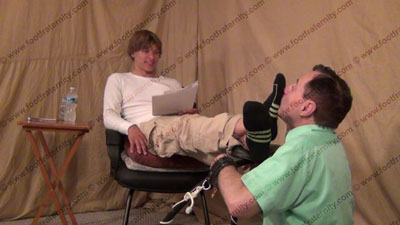 After work, Justin - a 20 year old high jock, in khaki pants, sneakers & sweaty dark work out Adidas socks relaxes on the easy chair with his foot slave caught in his sissy trap for the service of his sweaty socks then bare feet. During service, he reads his slave's confession letter, tells of his thoughts as he teases his foot slave verbally & with his socked, then bare feet. Slave starts smelling, kissing and sniffing the socked feet, while Justin is amused and arrogantly takes the worship. He chills & relaxes while watching the helpless slave caught at his feet. Straight jocks rule as his sissy serves his sweaty socked feet, then licks, kisses & serves his sweaty bare feet. Toes over the nose, toes licked, kissed, sweaty feet wiped in the face, etc. Three sensational views of this scene, one full length view, one close up & one from the bottoms showing the full while he dominates with his feet in your face. Justin does this in a teasing & arrogant, cocky manner and loves this control of having foot slaves at his feet. This young jock likes to have a slave worship his feet & uses his power over him in teasing ways. In this trap, there is no getting away from the Master’s feet while he relaxes & enjoys the power. He wiggles his toes and flexes his feet during the whole time, just to tease with his perfectly shaped feet. Lots of teasing & relaxing as he controls, talks & teases while his sissy has to worship his feet from the sissy trap.