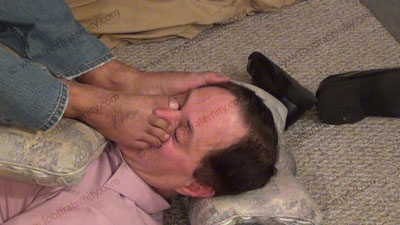 He stops by, in Tommy H shirt, sheer cap toe & heel dress socks which are removed right away so action can be done to his sweaty bare feet. Roberto continues with the letter that came from the tattoo artist who is also straight and will be doing a tattoo of Master Roberto's feet on his slave for permanent proof of his worship to the God's feet. He teases & laughs at the power he has to take control with his feet & forces him to serve as his foot slave bitch slut full time and he torments him & fills a glass by spitting loogies in it for the bitch to now be forced to beg to drink in front of this macho, straight stud. He sits on easy chair & has the foot slave beneath his feet, & to be his total foot slave & foot stool while he reads the most humiliating response from the homophobic tattoo artist. This is all REAL! He gives his commands, domination & humiliates his slave & loves the power as he teases, & controls his slave who NEEDS to serve his feet & amuse him in ANY humiliating way. Foot worship, foot kissing, foot service while COMPLETE HUMILIATION that his slave will have an imprint of his feet in the tattoo that will be on the sissy's back and chest. Three sensational views of this scene, two full views, & one close up. Roberto has sweaty sox put back on & uses the foot whore's face as a plaything for his macho, alpha, sweaty bare toes & feet as slave has to give him an expensive designer jacket for receiving all of this humiliation. Roberto pours the glass of loogies/spit in the sissy's mouth, forcing him to swallow every drop. Truly an ultimate fantasy. Roberto had so much fun with the reality of this situation that it takes a few DVDs to show the full scene. These three DVDS are loaded with humiliation, domination, teasing & much more!