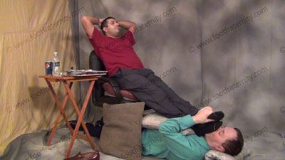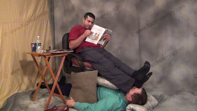 Roberto is sitting on in his easy chair & has his sissy lying on the floor beneath his feet as he sniffs & worships Roberto's sweaty dark dress socked feet, serving them as he mocks and laughs to show that foot sissys belong beneath his superior Macho feet! In casual clothes, penny loafers & smelly socks, Roberto forces him to whiff his sweaty dark dress socks as he rubs them all over his face and holds the sissy’s nose with his sweaty socked toes while laughing at him and teasing him. No script here, this is all real. Roberto makes the slave kneel to him & strap an ash tray in his mouth and kneel to him while holding his cigarette in the ash tray and massaging his feet while Roberto looks at hot mags. It's totally humiliating to be a kneeling human coffee table ash tray for this arrogant, cocky Master and massage his feet during the mouth gag ash tray device. VERY new and erotic as the Master laughs at his power and control just growing. Then the sissy becomes his foot stool in many positions as the Master quietly reads his hot magazines, ignoring his slave foot stool slave. Three sensational views of this scene, one full length view, one close up & one from the bottoms showing the full body of Roberto as though the camera was your face while he dominates with his feet in your face. Roberto has his feet massaged in a controlling & arrogant, cocky manner and loves this power of having foot slaves at his feet as this is VERY REAL to him to be treated this way with a slave making love to his feet as he ignores him.