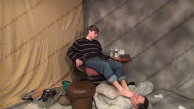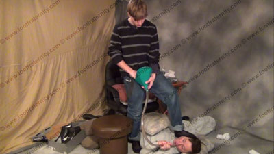 In slacks & dark thick and thin sweaty socks, black Bass loafers & black T-shirt, Justin has his slave on the floor & sits in his easy chair while forcing his sweaty socks in the face & teasing & humiliating his slave. He pulls his sweaty underwear over the slave's face, forcing him to whiff them. He does everything - water sports with the bong several times, spitting loogies in the face and mouth, standing on him, gifts presented to him, foot worship and much more. He feet are in his sissy's face while taking over power & laughing at the control. Three great views, two full, one close up. He watches & teases while worship is done to his sweaty socked then bare feet. This hot young teenage Stud makes fun of the fact that he is straight & can do this to his foot slave, making him beg for more. Full teasing attitude, much amusement & teasing & smelling his socked feet, spit, water sports, etc. - ANYTHING he wants! Giving good verbal & loving the power he now has while his feet are being worshipped & serviced. He teases & embarrasses his slave in a powerful manner. Verbal teasing & control & much more. He teases with the water sports bong several times for slave to drink it & be humiliated. Total humiliation, smelling his feet, licking his feet, kissing feet. Bare foot & socked foot action. Very good teasing domination scene of this really hot young guy who likes having and owning foot slaves who are serving his feet & every other need.