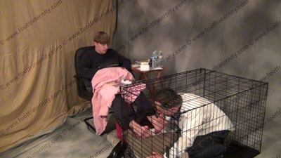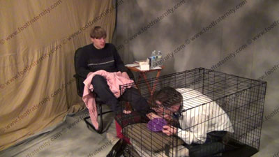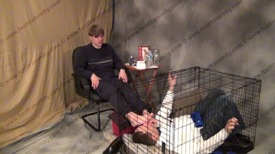 In black work out pants & blue Under Armor sweaty athletic socks & T-shirt, Justin has his slave locked in a dog cage & sits in his easy chair while forcing his slave to humiliate himself as he shoves his feet through the bars of the cage into his bitch's face for sock and bare foot worship. He uses the water sports bong, forcing the sissy to drink every drop while caged, then looks at some hot magazines and sure enough reaches a pleasure moment then forces his slave to clean it up off a plate! There is sweaty socks in the face & teasing & humiliating his slave. He does it all - water sports with the bong, spitting, sock sniffing, foot worship & a climactic moment that you don't want to miss. He feet are in his sissy's face while taking over power & laughing at the control as he holds the dog leash collared to his slave dog. He feeds him a dog biscuit from between his young toes. His sweaty feet are put over the nose for many helpless moments while caged. Three great views, two full from opposite angles, one close up. He watches & teases while worship is done to his sweaty socked then bare feet. This hot young Stud makes fun of the fact that he is straight & can do this to his foot slave, making him beg for more. Full teasing attitude, much amusement. He teases & embarrasses his slave in this humiliating manner. Verbal teasing & control & more. Can you say j/o? This guy is loving the power trip and knows how to treat a foot slave & dominate in every manner. This one is simply too hot and what you've been waiting to see and experience with this young arrogant guy.