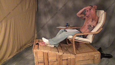 In jeans & bare chest, construction boots & sweaty white socks, Burke has his slave locked in the confinement crate with only face exposed & sits over him while forcing his sweaty socked feet in the face & teasing & humiliating his slave. He sits on his servant’s face quite a bit for butt worship while looking at a magazine. Three great views, two full, one close up. He talks about the foot slave with commands & teasing, all about why he loves this service & worship to his sweaty socked feet. This young stud makes fun of the fact that he is straight & can do this to a slave, making him beg for more. Full teasing attitude, much amusement & teasing & smelling his socked feet - ANYTHING he wants! He smokes a cigarette while using slave’s face as a foot stool. Stands on slave’s face while he is in the confinement crate. Giving orders & loving the power he now has while his feet are being worshipped & serviced. He teases & embarrasses his slave in a fun, easy going, and cocky manner. Verbal teasing & control. ALL SOCK ACTION in Part A.
