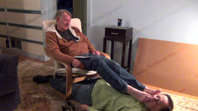 On a lazy Saturday, middle aged Rodd, in jeans & dark dress socks relaxes on the easy chair with his foot slave laying under his chair for service of his sweaty socks then bare feet. During service, he tells of his thoughts after 20+ years of having foot slaves as he teases his foot slave verbally & with his socked, then bare feet. He comes up with new commands & ideas & loves this power he has beneath his perfect feet. Slave starts smelling, kissing and sniffing the socked feet, while Rodd arrogantly takes the worship. He chills & relaxes while watching the helpless slave caught beneath his feet. Straight jocks rule as his sissy serves his sweaty socked feet, then licks, kisses & serves his sweaty bare feet. Toes over the nose, toes licked, kissed, sweaty feet wiped in the face, as his sexy deep voice gives commands, laughs & loves the power & adoration. Two sensational views of this scene, one full length view, one close up while he dominates with his feet. Rodd does this in a teasing & arrogant, cocky manner and loves this control of having foot slaves at his feet. He wiggles his toes and flexes his feet during the whole time, just to tease with his perfectly shaped high arched feet. Lots of teasing & relaxing as he mocks & laughs while his sissy has to worship his feet. VERY erotic as the Master laughs at his power and control just growing thru the years.