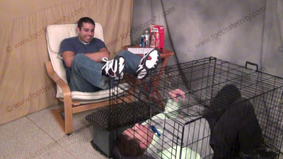 In jeans, sneakers & sheer burgundy OTC socks, Roberto has his slave has his slave locked in a dog cage & sits in his easy chair while forcing his caged slave to grovel & place himself beneath the feet of this Latino stud. There is sweaty socks in the face & teasing & humiliating his slave. He has slave handcuffed to the cage for sock sniffing, foot worship, total humiliation, teasing and more. He feet are in his sissy's face while taking over power & laughing at the control. This Alpha Stud makes fun of the fact that he is straight & can do this to his foot slave, making him beg for more. Full teasing attitude, much amusement & teasing & smelling his socked feet, spit, etc. He embarrasses his slave in a controlling manner & dangles the key to the handcuffs just out of the reach of the foot slave. Smelling his feet, licking his feet, kissing feet. Verbal teasing & control & more. Roberto is loving the power trip and knows how to rule a foot slave & dominate while taking blackmail photos. The fantasy becomes reality! He feet are in his sissy's face while taking more power & laughing at the control as he holds the dog leash collared to his caged slave dog. He feeds him a dog biscuit from between his sweaty toes. His feet are put over the nose for many helpless moments while his bitch is caged the whole time. Two great views, one full, one close up & a bit from a third view. Slave has a dog collar and leash controlling him. Roberto watches & teases while worship is done to his sweaty socked then bare feet. This hot Stud makes fun of the fact that he is straight & can do this to his foot slave, making him beg for more. He teases & embarrasses his slave in this humiliating manner. This guy is loving the power trip and knows how to treat a foot bitch dog & dominate in every way. This film is too hot and what you've been wanting to see and experience with this Macho controlling guy who can take it to the limits.