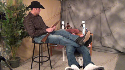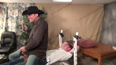 Cowboy Morgan comes to Austin's workout room, to find him strapped to the work out bench for him to shove his dirty boots his face for worship. Austin is helpless as Morgan sits on his face, teases with his boots while Austin is helpless. Morgan makes him sniff butt & more. He forces his boots in his face, on his chest, & in his crotch. He thinks of many ways to embarrass the guy including total worship of those huge size 15 macho boots. He puts one boot in his face and one on his crotch! Total humiliation & domination. Austin is humiliated as he has to take what this macho jock dishes out. Much teasing & hot talk while his boots & other things are sniffed, licked, kissed and serviced in all ways. Morgan places his boots and butt in the sissy’s face most of the time. He kicks butt & uses him as a foot prop. Four sensational views of this unbelievably real scene. Much teasing & laughter while the jock has his macho booted feet in the slave’s crotch & are in EVERY position with the helpless slave. He finds uses for the riding crop & horse saddle on different "parts" of Austin's helpless body! This is every gay man’s fantasy come to reality! It just doesn’t stop. Then Morgan teases Austin in other hot ways! Really very HOT!