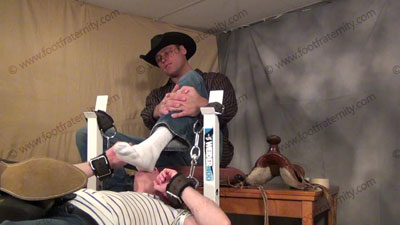 The previous scene continues as Cowboy Morgan is in Austin's workout room, with him strapped to the work out bench for him to remove his dirty boots for worship of his sweaty white socked feet. Austin is helpless as Morgan sits on his face, teases with his socked feet while Austin is helpless. Morgan makes him sniff butt & more. He forces his socks in his face, on his chest, & in his crotch. He thinks of many ways to embarrass the guy including total worship of those huge size 15 macho sweaty socked feet. He puts one foot in his face and one on his crotch! Total humiliation & domination. Austin is humiliated as he has to take what this macho jock dishes out. Much teasing & hot talk while his socked feet & other things are sniffed, licked, kissed and serviced in all ways. Morgan places his feet and butt in the sissy’s face most of the time. He totally teases & uses him as a foot prop. Four sensational views of this unbelievably real scene. Much teasing & laughter while the jock has his macho socked feet in the slave’s crotch & are in EVERY position with the helpless slave. He finds uses for the riding crop & horse saddle on different "parts" of Austin's helpless body! This is every gay man’s fantasy come to reality! It just doesn’t stop. Then Morgan teases Austin in other hot ways! Really very HOT!