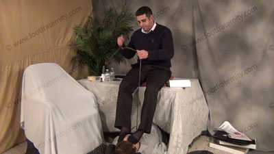Roberto dressed up after work; black sheer cap toe, thick & thin dress sox; gifts; domination, humiliation; blackmail; barefoot & sock worship; he sits on table over slave who is on the floor; teasing; taunting; slave on a leash; then uses leash to tie master's feet to his face; commands & orders; slave uses cash to light his Master's cigarette; ashing; putting cigarette out on slave's tongue; Roberto does a demonstration for Straight guys on how to dominate a foot slave; three views (one full, two hot close up angles).