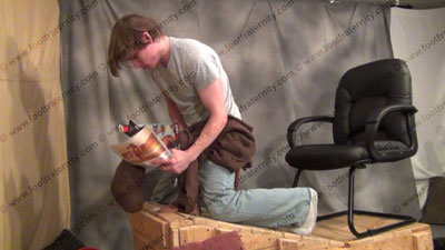 In jeans, black work boots, hoodie (later a T-shirt) and his long "Bieber like hair", sweaty white socks, then bare foot service, adoration & service; Justin sitting on the crate over slave to shove his feet in the face which is pinned in position, locked in the crate; sits on slave's face; "rubs one off" in slave's face and mouth - brushes it in sissy's mouth; domination, humiliation; trample his face; teasing; forced sock & bare foot worship; toe & foot flexing; all over the exposed face; three camera views (one close up) & two other very sensual angles.