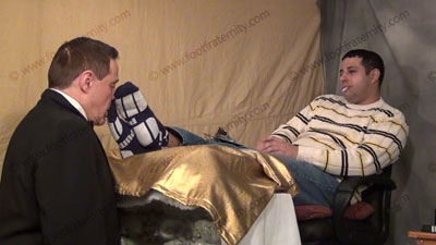 Roberto in jeans & sneakers; Puma white & blue well worn sox; expensive gifts for the service; domination, humiliation; blackmail; new vows to the feet for the third time; slave in tux while kneeling at the feet on a pedestal ready for vows; barefoot & sock worship; he sits on easy chair while slave is kneeling on the floor; teasing; taunting; huge loogies; marriage ritual & orders; slave uses cash to light his Master's cigarette; ashing; Roberto proves that Straight guys can own & dominate a foot slave; three views (two full, one hot close up angle).