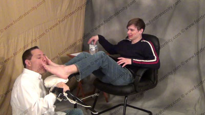 In jeans, black work boots and his long sexy hair, sweaty black short gym socks for worship, then bare foot service, adoration & service; Justin has his slave in sissy trap to serve his feet in the face; hot verbal as he answers questions about foot sissys; water teasing, mocking, tormenting with his young feet, loving the power trip; he smiles & just sits back while watching the helpless slave serve his youthful feet; hot talk; teasing; toying sock & bare foot worship; toe & foot flexing; all over the face; three camera views (one close up) & two other very sensual angles.