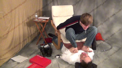 In jeans, black work boots and his long sexy hair, sweaty white with black Adidas stripes short socks for worship, then bare foot service, adoration & service; Justin sitting over his slave to rest his feet in the face; water sports, using the bong while holding sissy's face in place with his foot; spits huge loogies in slaves mouth & face; he smiles & just sits back while watching the helpless slave serve his youthful feet; hot talk; teasing; toying sock & bare foot worship; toe & foot flexing; all over the face; makes "fun" of his foot slave, laughs & loves the power; three camera views (one close up) & two other very sensual angles.