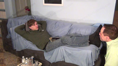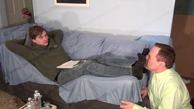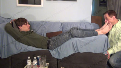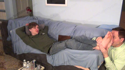 In jeans, Bass Weejuns, black dress socks and his long sexy hair; socked feet for worship, then bare foot service, adoration & service; Justin lying on the sofa with slave kneeling at his feet; he smiles & just lays back while watching the helpless slave serve his youthful feet; he likes to just watch & take in his power and control without having to say a word; teasing; toying sock & bare foot worship; toe & foot flexing; all over the face; hot verbal talk, he smiles & loves the power; Justin is chillin' while slave has to lick, kiss and do everything to his feet; he is arrogant because he knows how hot he really is; he tells a little about how he can rule foot slaves; three camera views (one close up) & two other very sensual angles.