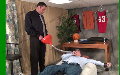 Well dressed Morgan in shirt, tie, lace up shoes, dark dress socks come for an interview with a sports commissioner to find his son, Cory, strapped to a bed in the room. Morgan figures out how he can get this job by teasing the slave; Cory is helpless as Morgan sits on his face, teases with his socked feet. Morgan makes him sniff butt & more; He forces his socks in his face, on his chest, & in his crotch; He thinks of many ways to embarrass the guy including total worship of those huge size 15 macho sweaty socked feet; He puts one foot in his face and one on his crotch! Total humiliation & domination; blackmail material is found by Morgan; much teasing & hot talk while his socked feet & other things are sniffed, licked, kissed and serviced in all ways; Morgan places his feet and butt in the sissy’s face most of the time & films it to use to get Cory's dad to give him the job since this is a secret for Cory; toe nail clippings being force fed; belching; much foot in crotch; water sports as Morgan uses the piss bong to force Cory's humiliation; close ups; Much teasing & laughter while the jock has his macho socked feet in the slave’s crotch & are in EVERY position with the helpless slave. (Part A is from two hot angles.)
