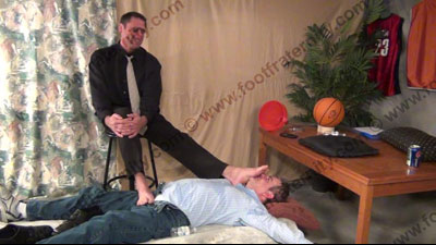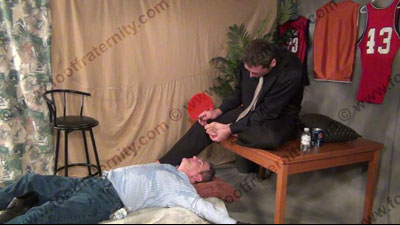 Well dressed Morgan in shirt, tie, lace up shoes, dark dress socks come for an interview with a sports commissioner to find his son, Cory, strapped to a bed in the room. Morgan figures out how he can get this job by teasing the slave; Cory is helpless as Morgan sits on his face, teases with his socked feet. Morgan makes him sniff butt & more; He forces his socks in his face, on his chest, & in his crotch; He thinks of many ways to embarrass the guy including total worship of those huge size 15 macho sweaty socked feet; He puts one foot in his face and one on his crotch! Total humiliation & domination; blackmail material is found by Morgan; much teasing & hot talk while his socked feet & other things are sniffed, licked, kissed and serviced in all ways; Morgan places his feet and butt in the sissy’s face most of the time & films it to use to get Cory's dad to give him the job since this is a secret for Cory; toe nail clippings being force fed; belching; much foot in crotch; water sports as Morgan uses the piss bong to force Cory's humiliation; Three sensational views of this unbelievably real scene with close ups. Much teasing & laughter while the jock has his macho socked feet in the slave’s crotch & are in EVERY position with the helpless slave. (Part B is from two other hot angles.)