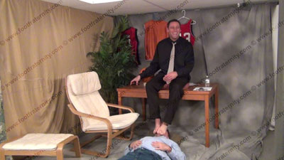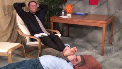 Well dressed Morgan in shirt, tie, lace up shoes, dark dress socks sitting back to be interviewed on TV while Cory takes his place as his foot slave. Morgan tells how this all started and how he became the foot Master that he is today; Cory is helpless as Morgan teases with his socked & much with his bare feet. Morgan makes him sniff his crotch thru his pants & more; He forces his feet in his face, on his chest, & in his crotch; He thinks of many ways to embarrass the guy including total worship of those huge size 15 macho sweaty socked feet; He puts one foot in his face and one on his crotch! Total humiliation & domination; much teasing & hot talk while his socked feet & other things are sniffed, licked, kissed and serviced in all ways; Morgan places his feet and butt in the sissy’s face for ass worship & sniffing & shows the audience how it's done to totally humiliate a slave with his feet, ass, crotch and more; belching; much foot in crotch; water sports as Morgan uses the piss bong to force Cory's humiliation; Several sensational views of this unbelievably real scene with close ups. Much teasing & laughter while the jock has his macho socked feet in the slave’s crotch & are in EVERY position with the helpless slave.