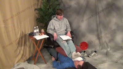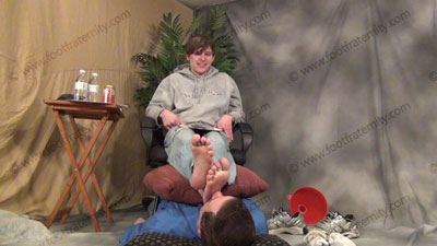 In jeans, sneakers, hoodie, sweaty white socks, & bare foot licking & worship; much bare foot flexing & wiping in the face; Justin sitting on an easy chair with slave beneath his feet ready to be totally embarrassed & humiliated in many ways; slave becomes Justin's foot rest; sock and bare foot worship; spit; teases; mocks; gives orders & talks about the power; then takes slave's dignity for allowing him to serve his feet; three camera views (one close up) & two other very sensual angles.