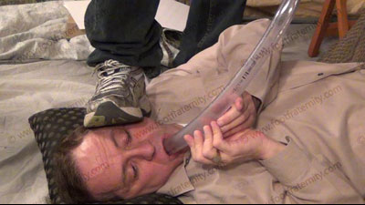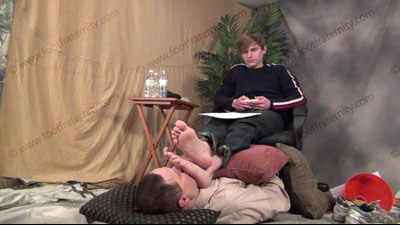 In jeans, sneakers, sweaty black socks, he uses the bong again to force sissys to drink his w/s; bare foot licking & worship; foot flexing & wiping in the face; Justin sitting on an easy chair with his slave beneath his feet ready to be totally embarrassed & humiliated in many ways; slave becomes Justin's foot rest; sock and bare foot worship; spit; teases; mocks; Justin gives orders & talks about the power; laughs; torments; flexes bare feet in his face & more; three camera views (one close up) & two other very sensual angles of his young feet.