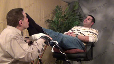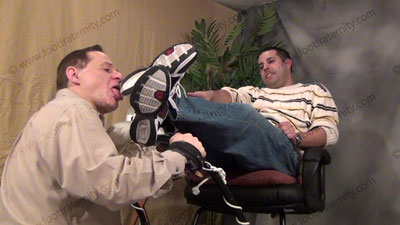 In jeans, sneakers, sweaty dark socks, with his slave in the sissy trap foot stool - face at foot level for sock sniffing & bare foot licking & worship; Roberto sitting on an easy chair with slave pinned at his feet ready to be totally embarrassed & humiliated; spit; teases; mocks; gives orders as he just sits and watches the humiliation; foot licking; sock action; Roberto just relaxes and watches while laughing, mocking & controlling his bitch who is locked at his feet; three camera views (one close up) & two other very sensual angles.
