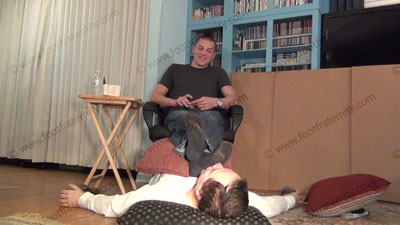 In jeans, T shirt, boat shoes, sweaty black socks, this hot straight athletic jock, Ridge is sitting in a chair with his bitch beneath his feet to worship & sniff the sweaty socks, then the dirty bare feet; Ridge laughs, describing how Straight Guys Rule; humiliates slave at his feet ready to be totally embarrassed while he tells his bitch how he will force him to worship his feet from this day forward. He plans to have foot sissys pay to serve his feet all the time; Ashing in sissy's mouth; Sock and bare foot worship; teases; mocks; gives orders; foot rest; foot stool; humiliates him by allowing him to serve his feet; Ridge is cocky, arrogant and looks just like Apollo's brother!; He laughs about having a foot slave because he is straight; three camera views (one close up) & two other very sensual angles. He is amused at this power; Socks sniffed, kissed; bare feet licked, toes sucked - while he humiliates & dominates & does all sorts of humiliating things to his bitch foot sissy! He sits back & watches the power that he has with his feet.
