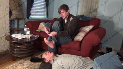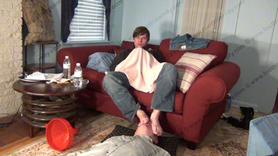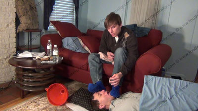 In jeans, shirt, sweaty blue Under Armor socks, this hot straight "Bieber" jock, Justin is lying on the sofa while slave kneels at his feet to worship & sniff the sweaty socks, then the dirty bare feet; Justin laughs, knowing that he rules & humiliates slave at his feet ready to be totally embarrassed when Justin enjoys a "smoke" while the slave is serving his feet: sock and bare foot worship; teases; mocks; gives orders; then humiliates him by allowing him to serve his feet; Justin is cocky, arrogant and teases about knowing the sissy's need to be at his feet; spits; Then Justin sits up to watch "Girls Gone Wild" with slave underfoot as he "rubs one off" for slave to lick up; slave in many positions under the young feet; then Justin does W/S using the bong for slave to swallow the whole thing; then he clips his toe nails in the slave's open mouth; three camera views (one close up) & two other very sensual angles. Socks sniffed, kissed; bare feet licked, toes sucked.