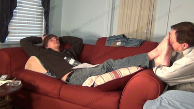 JUSTIN CHILLIN' ON THE SOFA WITH FAG SERVING HIS FEET ON HIS KNEES