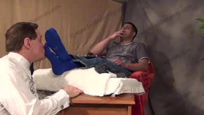 In jeans, sneakers, sweaty blue Under Armor socks, (for sock only worship); Roberto sitting on a throne with slave kneeling at his feet ready to be totally embarrassed & humiliated as he celebrates his 14th anniversary of marriage to the feet of this stud; many gifts are placed at his feet in thanks for being married to his straight feet as he laughs and takes everything; socked foot worship; spit; teases; lights his cigarette with cash; mocks; gives orders; then takes more for allowing him to serve his feet; blackmail photos to his brother, Master Winston; slave kneeling at his Master's feet, while in a tux the while time; three camera views (one close up) & two other very sensual angles. Many erotic surprises in this film series!
