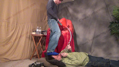 In jeans, his high school sneakers, sweaty blue Under Armor socks, then bare foot licking & worship; Justin sitting on a throne with slave on the ground at his feet ready to be totally embarrassed & humiliated as he dominates, tells all about having foot slaves & he laughs; sock and bare foot worship; teases; mocks; gives orders; then pulls out the bong for W/S; then does water sports in an ice cube tray for slave to freeze for the next session; a little bit of trampling his slave in the new kicks presented at his feet; slave beneath his Master's feet the whole time in many positions as a foot wipe; three camera views (one close up) & two other very sensual angles. Many erotic surprises in this film series! Socks sniffed, kissed; bare feet licked, toes sucked the whole time.