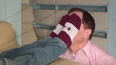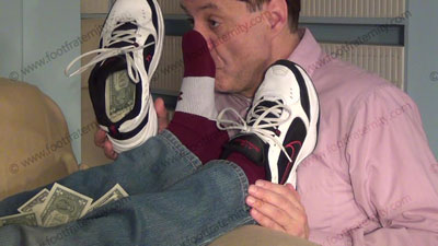 In jeans, T-shirt, sweaty burgundy Under Armor sport socks, this hot straight stud is lying on the sofa while slave kneels at his feet to worship & sniff the sweaty socks, then the dirty bare feet; Roberto laughs, knowing that he rules & humiliates slave at his feet ready to be totally embarrassed when the slave is serving his feet: sock and bare foot worship; teases; mocks; gives orders; then humiliates him by allowing him to serve his feet; Roberto is cocky, arrogant and teases about knowing the sissy's need to be at his feet; slave "showers" him with cash, gifts; three camera views (two close ups) & one full length angle. Socks sniffed, kissed; bare feet licked, toes sucked as he is cocky, arrogant and demands the worship.